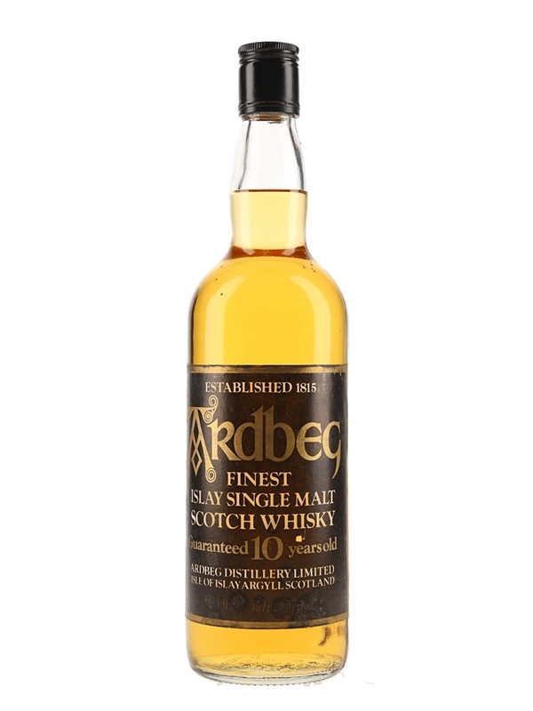 A bottle of Ardbeg 10 Year Old Finest Islay Single Malt Scotch Whisky presented in a clear glass bottle. We estimate this was bottled in the 1970s.