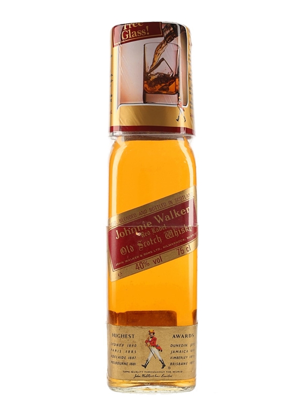 A bottle of Johnnie Walker Red Label Old Scotch Whisky, with a free glass. We estimate this was bottled in the 1980s.