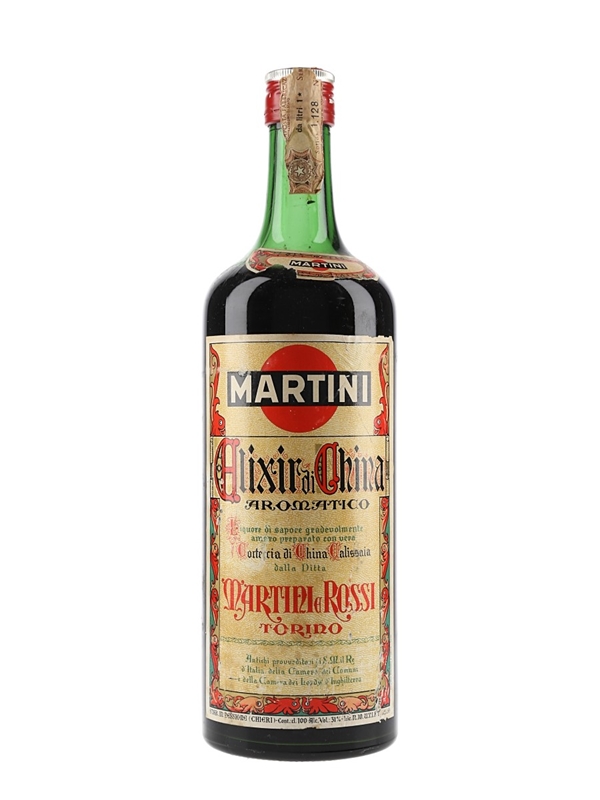 A litre bottle of Martini Elixir di China, a herbal liqueur flavoured with cinchona bark produced in Turin, Italy, by Martini & Rossi. We estimate this was bottled in the 1960s.