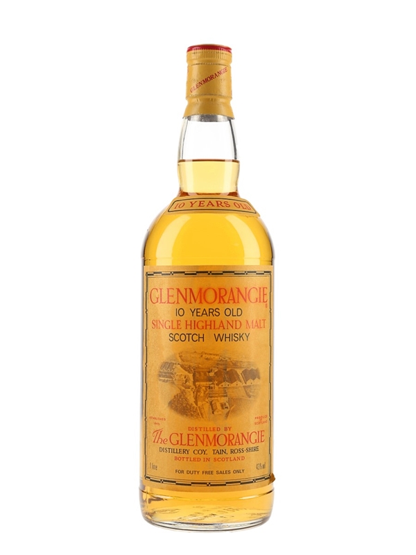 A litre bottle of Glenmorangie 10 Year Old Single Highland Malt Scotch whisky. This was bottled for the duty free market, we estimate in the 1980s.