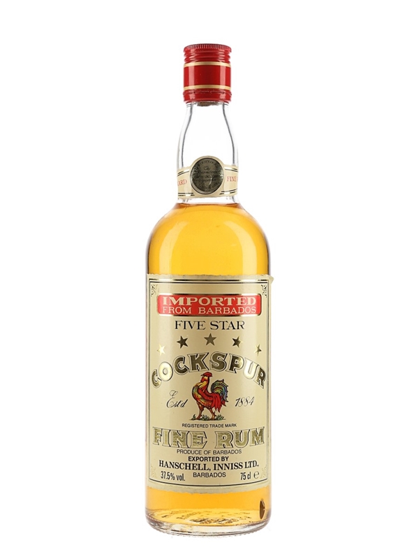 A bottle of Cockspur 5 Star Barbados Rum. This was aged for at least three years in oak casks, and imported by Hanschell Inniss, Bridgetown, Barbados. We estimate this was bottled in the early 1980s.