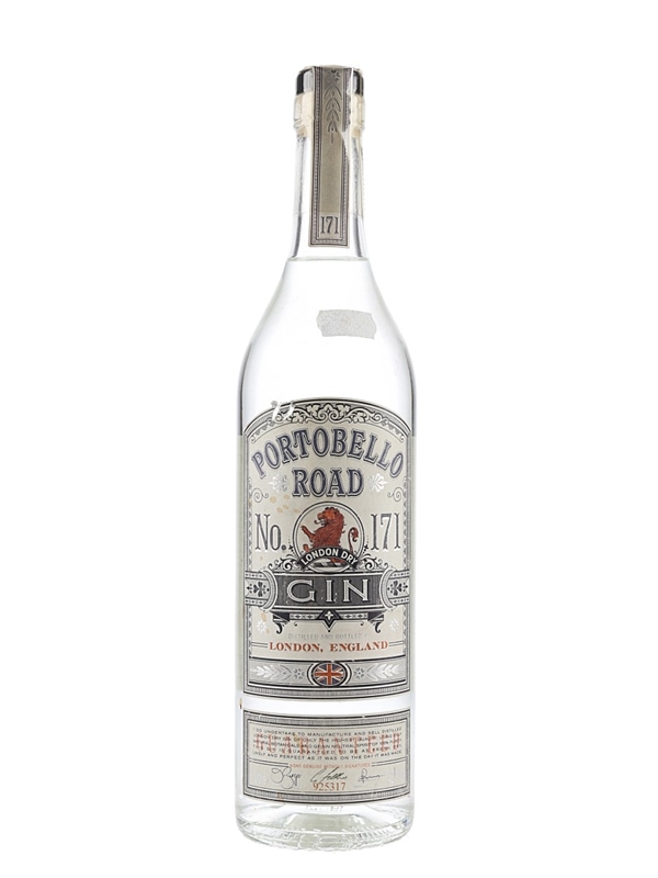 A bottle of Portobello Road No.171 London Dry Gin, made with a blend of nine natural botanicals.