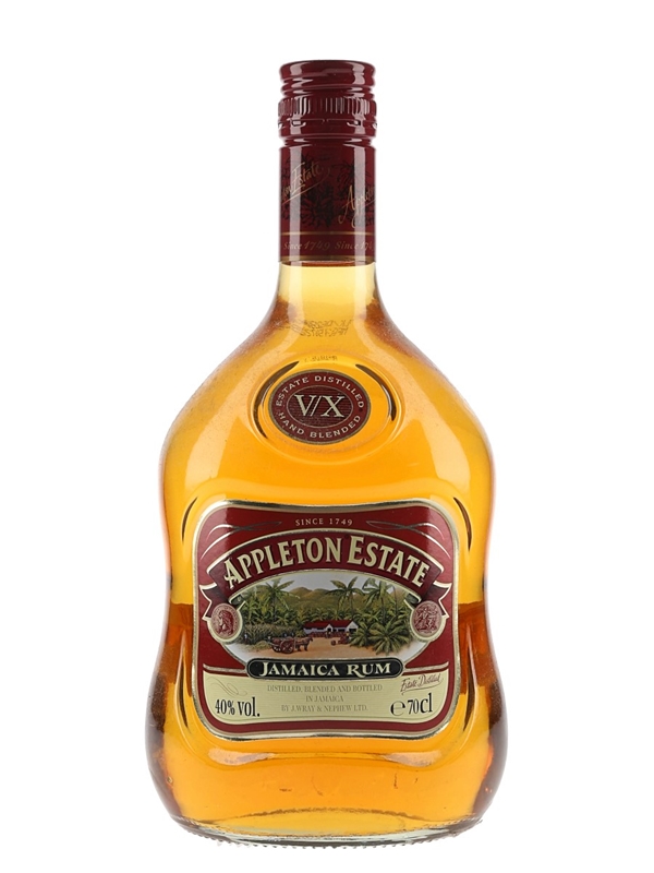 A bottle of Appleton Estate V/X Jamaica rum. This was distilled in copper pot stills, matured in oak casks, and bottled by J Wray & Nephew Ltd.