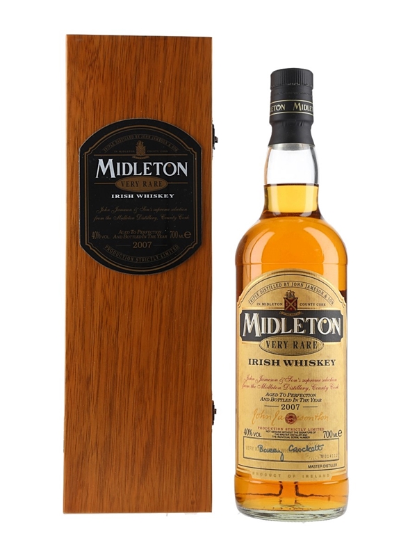 A bottle of Midleton Very Rare Irish Whiskey bottled in 2007. Every year since 1984, a new edition has been released in limited quantities. This comes in a wooden presentation box with a certificate of authenticity.