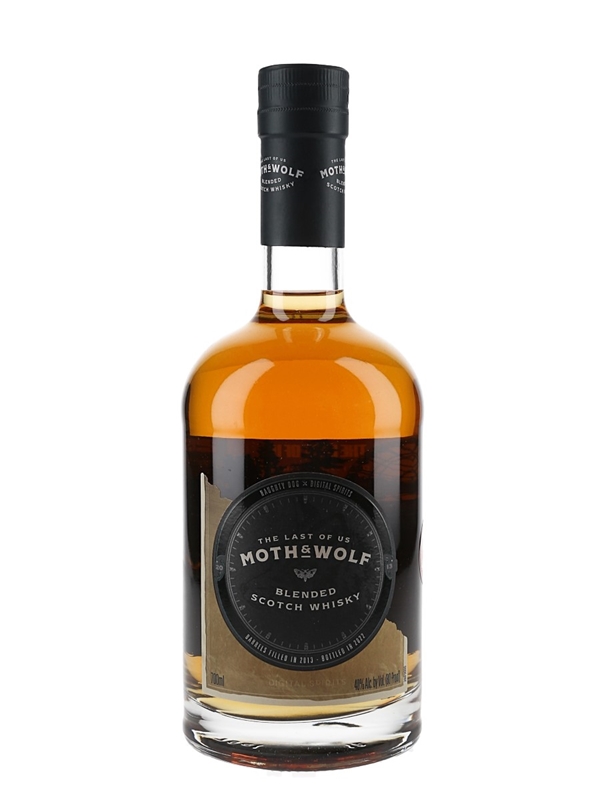 A bottle of the The Last Of Us Moth & Wolf Blended Scotch Whisky, a collaboration between Naughty Dog and Digital Spirits. This was filled into American oak barrels in 2013 and bottled in 2022.