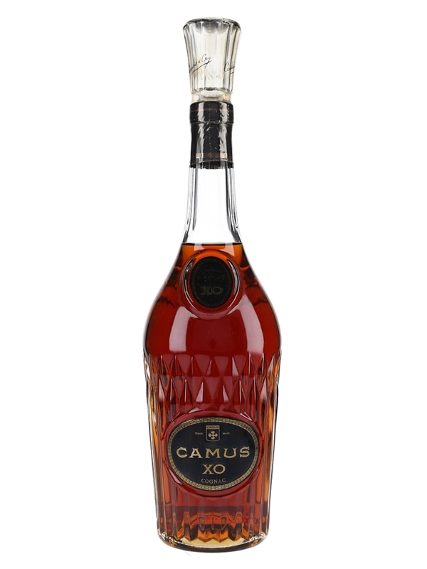 A bottle of Camus XO Cognac, presented in a tall, thin-necked decanter.