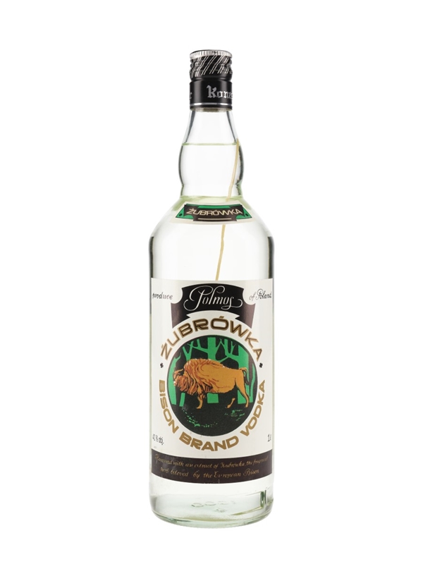A litre bottle of Zubrowka Bison Brand Vodka from Poland, produced by Polmos.