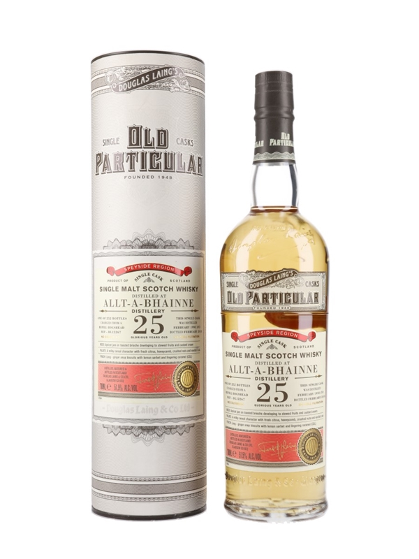 A bottle of Allt A Bhainne 25 Year Old Single Malt Scotch Whisky. This was distilled in 1993, matured in a single refill hogshead and bottled at 51.5% ABV in February 2018 by Douglas Laing & Co. for the Old Particular series.