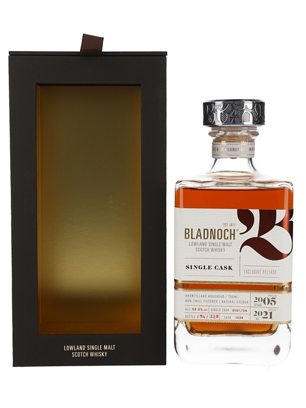 A bottle of Bladnoch Single Cask Exclusive Release Lowland Single Malt Scotch Whisky. This was distilled in October 2005, matured in a Amontillado Hogshead and bottled in May 2021 at a cask strength of 52% ABV. This is bottle number 194 of 338 bottles, bottled from cask number 1034.