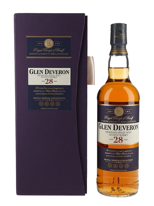A bottle of Glen Deveron 28 Year Old Highland Single Malt Scotch Whisky distilled at MacDuff distillery and matured in a high proportion of sherry casks.