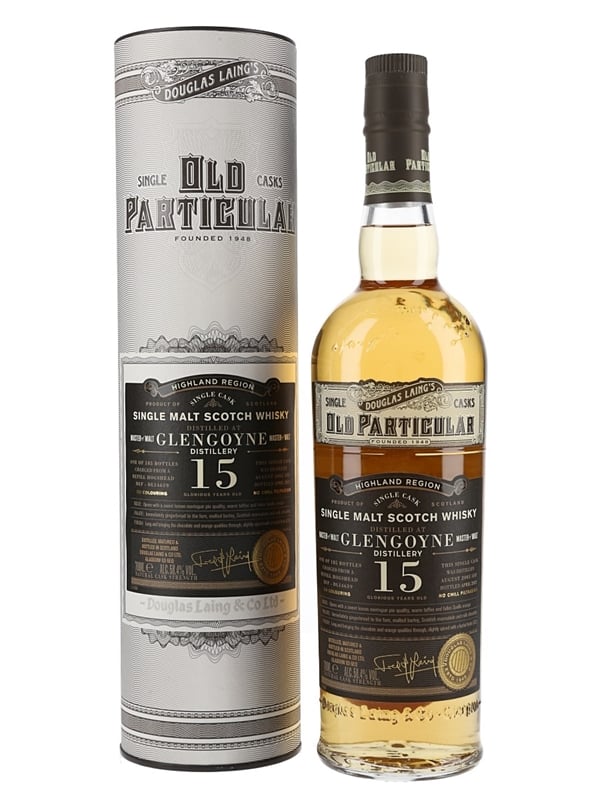 A bottle of Glengoyne 15 Year Old Single Cask Single Malt Scotch Whisky. This was distilled in August 2005, matured for 15 years in a single Refill Hogshead and bottled at a cask strength of 58.4% ABV in April 2021 by Douglas Laing for the Old Particular series for Master Of Malt.