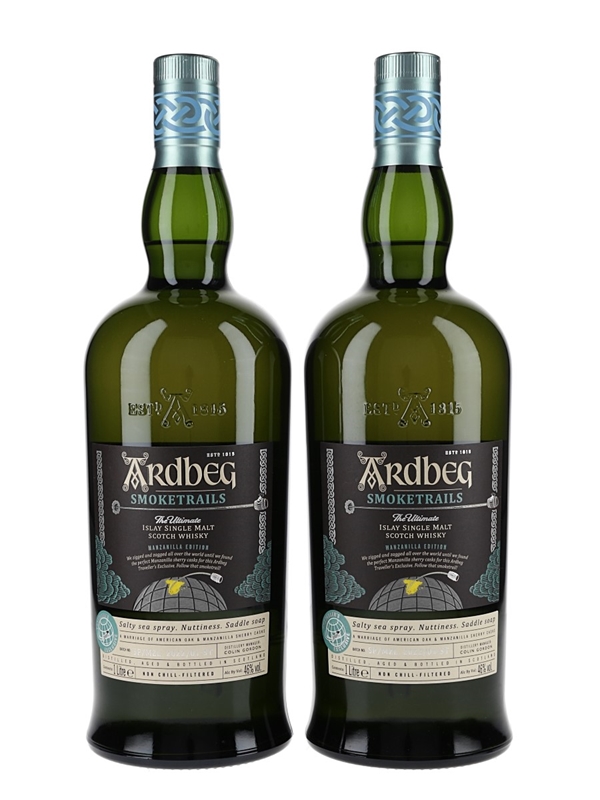 This lot contains two litre bottles of Ardbeg Smoketrails Islay Single Malt Scotch Whisky plus a bandana, a Traveller's Exclusive matured in American oak and Manzanilla sherry casks. This is from batch number SP/MZL: 2022/01-ST. This was released in 2022 and is the first expression in the Ardbeg Smoketrails series.
