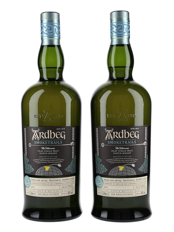 This lot contains two litre bottles of Ardbeg Smoketrails Islay Single Malt Scotch Whisky plus a bandana, A Traveller's Exclusive matured in American oak and Manzanilla sherry casks. This is from batch number SP/MZL: 2022/01-ST. This was released in 2022 and is the first expression in the Ardbeg Smoketrails series.