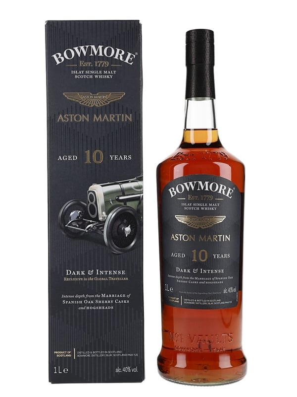 A litre bottle of Bowmore 10 Year Old Islay Single Malt Scotch Whisky, edition number one in the distillery's collaboration with Aston Martin. This was matured in a combination of Spanish oak sherry and hogshead casks.