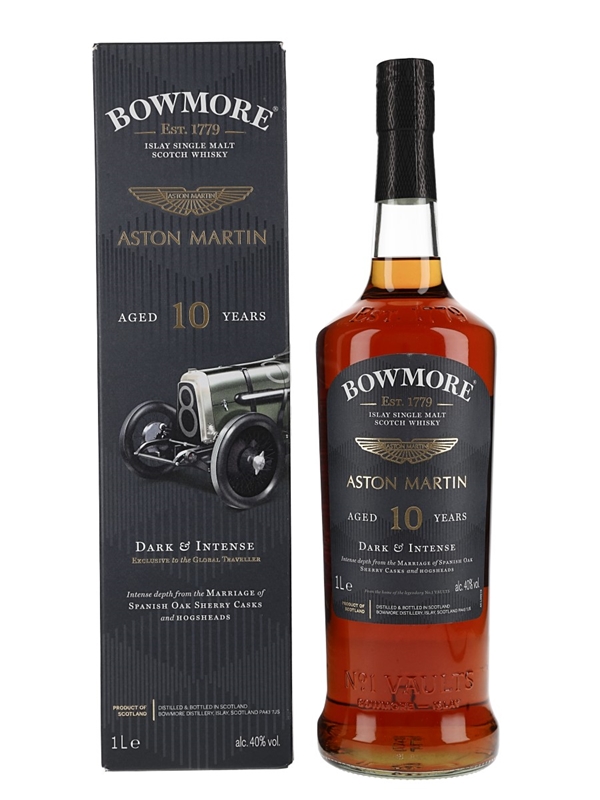 A litre bottle of Bowmore 10 Year Old Islay Single Malt Scotch Whisky, edition number one in the distillery's collaboration with Aston Martin. This was matured in a combination of Spanish oak sherry and hogshead casks.