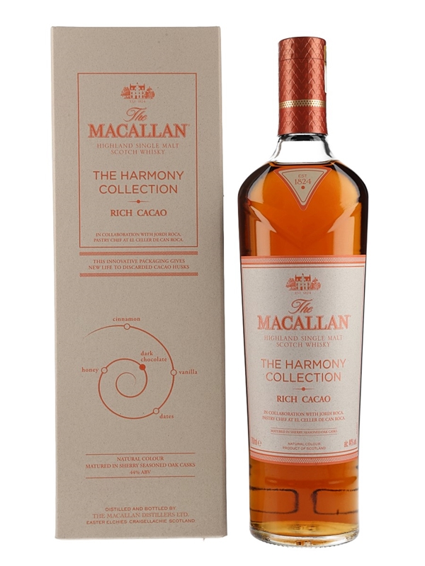 A bottle of The Macallan Rich Cacao Highland Single Malt Scotch Whisky from The Harmony Collection. This is inspired by the chocolate creations of Spanish chef Jordi Roca, pastry chef at El Celler de Can Roca. The restaurant was twice voted best restaurant in the world.