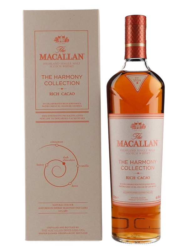 A bottle of The Macallan Rich Cacao Highland Single Malt Scotch Whisky from The Harmony Collection. This is inspired by the chocolate creations of Spanish chef Jordi Roca, pastry chef at El Celler de Can Roca. The restaurant was twice voted best restaurant in the world.