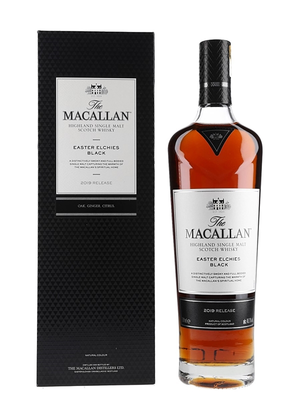 A bottle of The Macallan Easter Elchies Black Highland Single Malt Scotch Whisky, bottled at 49.7% ABV and released in 2019.