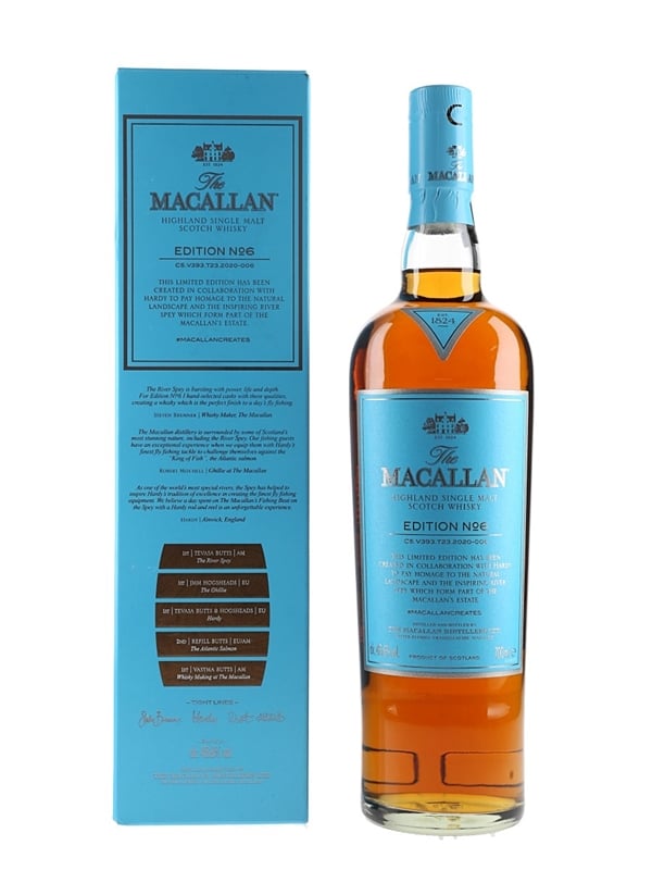 A bottle of The Macallan Edition No.6 Highland Single Malt Scotch Whisky, a limited edition matured in five distinct cask types and bottled at 48.6% ABV. This edition was created in collaboration with Hardy, a world renowned fly fishing brand, and supports the crucial conservation work of the Atlantic Salmon Trust.