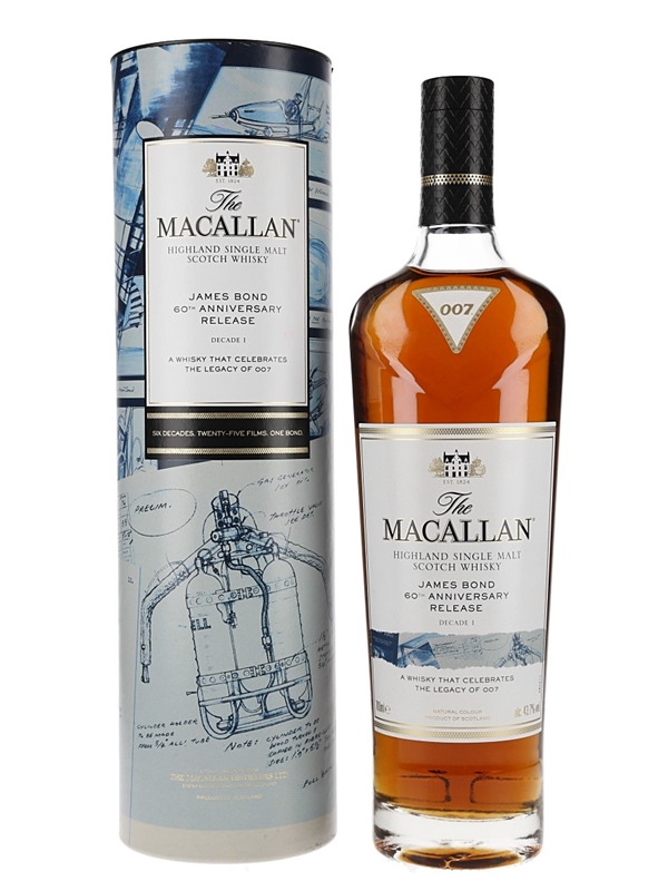 A bottle of The Macallan Highland Single Malt Scotch Whisky from the James Bond 60th Anniversary series, released in 2022. This is the Decade I release, celebrating the film series in the 1960s, with Sean Connery in the role of 007.This is one of six designs to capture each decade and features illustrations from the James Bond archive of equipment used by the secret agent in the movies.