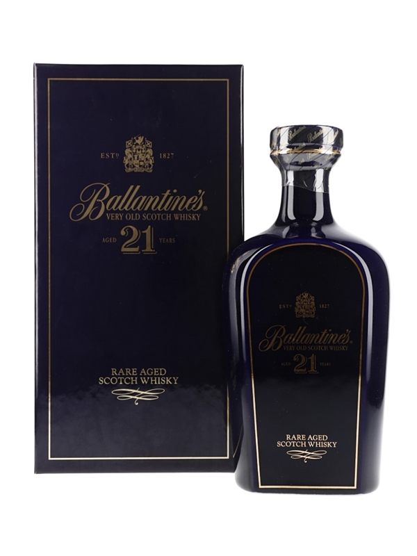 A bottle of Ballantine's 21 Year Old Rare Aged Scotch Whisky presented in a blue porcelain Wade decanter decorated with 22 carat gold.