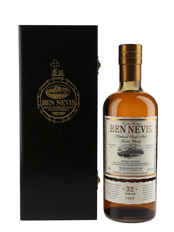A bottle of Ben Nevis 32 Year Old Highland Single Malt Scotch Whisky, distilled in June 1966 and bottled at a cask strength of 50.5% ABV in September 1998 as part of the Forgotten Bottlings series.