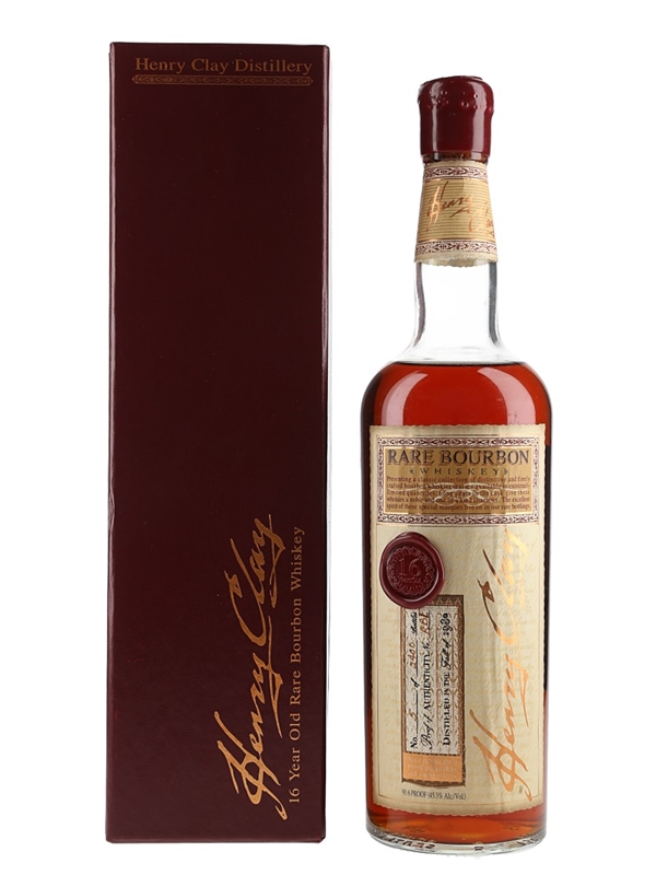 A bottle of Henry Clay 16 Year Old Rare Bourbon Whiskey. This was distilled in 1980, Louisville, and released in 1997 as part of the Rare Bourbon Collection from United Distillers.