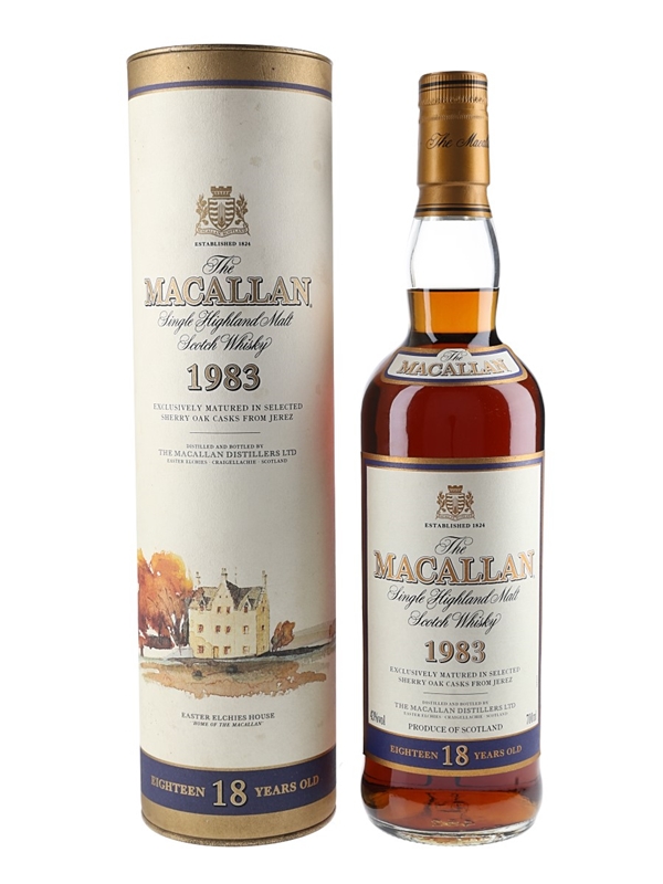 A bottle of The Macallan 18 Year Old Single Highland Malt Scotch Whisky. This was distilled in 1983 and matured exclusively in sherry oak casks from Jerez.