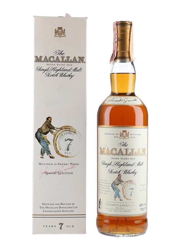 A bottle of The Macallan 7 Year Old, matured in sherry wood and selected by Armando Giovinetti for the Italian market. We estimate this was bottled in the late 1990s to early 2000s.