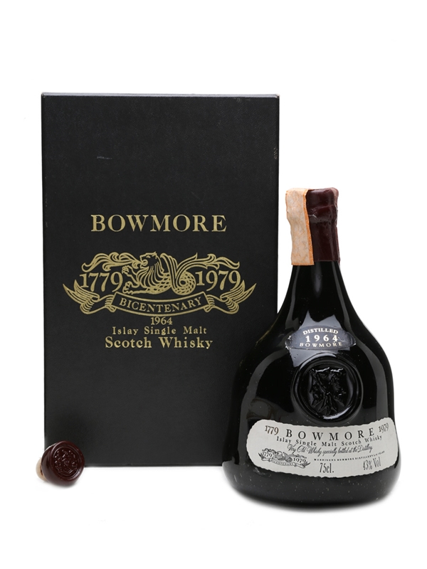 A bottle of Bowmore 1964, matured in sherry casks and bottled in 1979 to celebrate the distillery's Bicentenary. This is packaged in a hand-blown decanter with presentation box and stopper, and comes with a certificate of authenticity.