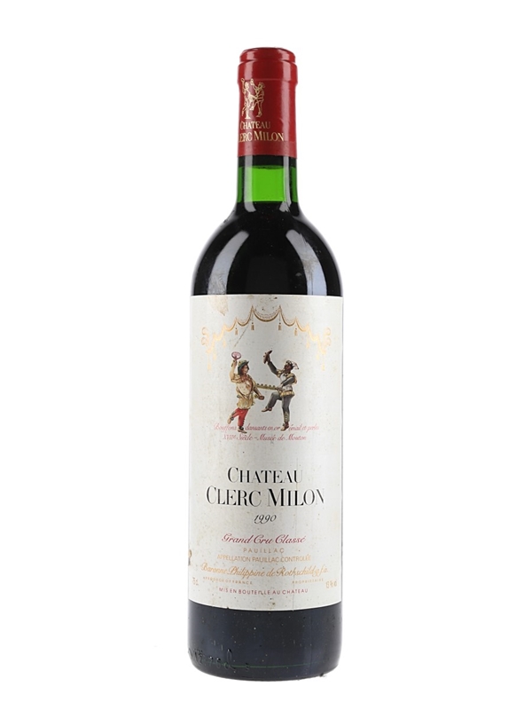 A bottle of 1990 Château Clerc Milon Grand Cru Classé from the Pauillac appellation in Bordeaux, a 'fifth growth' in the 1855 Bordeaux Classification.