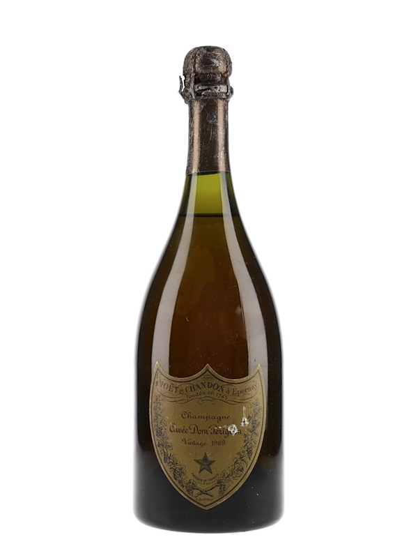 A bottle of Dom Pérignon 1969 vintage Champagne from Moët & Chandon. This is a blend of 50% Pinot Noir and 50% Chardonnay.