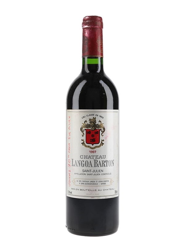 A bottle of Château Langoa Barton 1997, a 'Troisième Cru Classé' from Bordeaux's Saint-Julien appellation. Langoa is a 17 hectare property planted with a high percentage of Cabernet Sauvignon, 72%, making for a long-lived wine, with the balance being 20% Merlot and 8% Cabernet Franc.