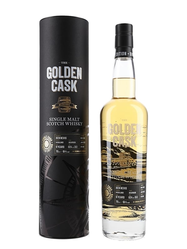 A bottle of Ben Nevis 9 Year Old Single Malt Scotch Whisky. This was distilled in November 2012, matured in a bourbon cask CM286, and bottled at 61.1% ABV in January 2022 by The Cumbrae Supply Company for their Golden Cask series.