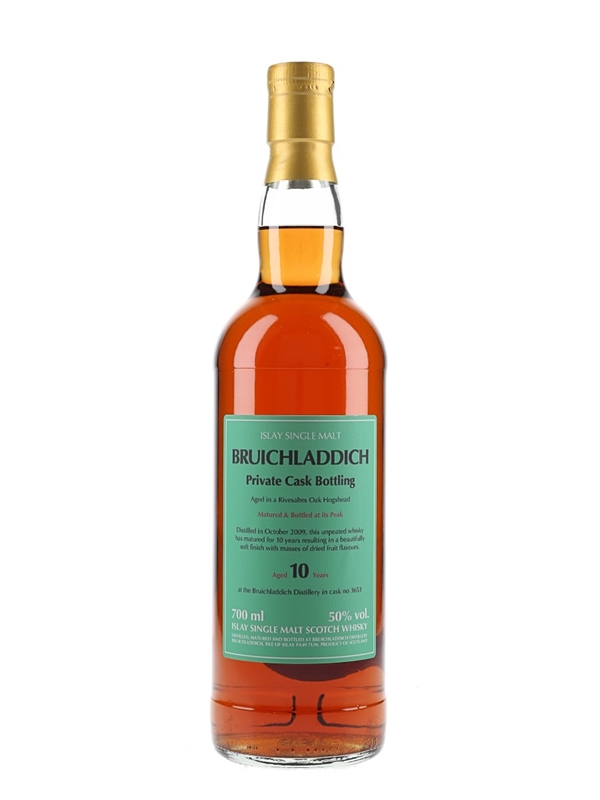 A private cask bottling of Bruichladdich 10 Year Old Islay Single Malt Scotch Whisky. This unpeated whisky was distilled in October 2009, matured in a single Rivesaltes hogshead and bottled at 50% ABV. This was bottled from cask number 3653.