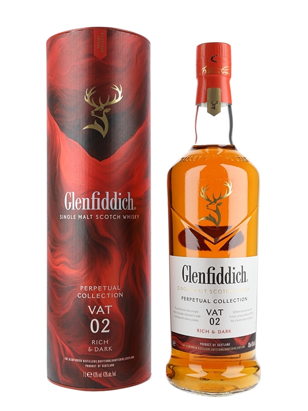 A litre bottle of Glenfiddich Perpetual Collection Vat 02 Single Malt Scotch Whisky. This was double matured in Spanish sherry casks before being married in their Solera Vat 02. This was bottled exclusively for global travel retail.