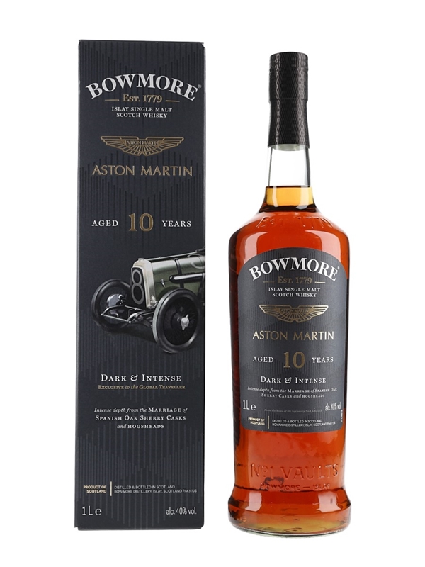 A bottle of Bowmore 10 Year Old Islay Single Malt Scotch Whisky made in collaboration with Aston Martin. This was matured in a combination of Sherry casks and Hogsheads.