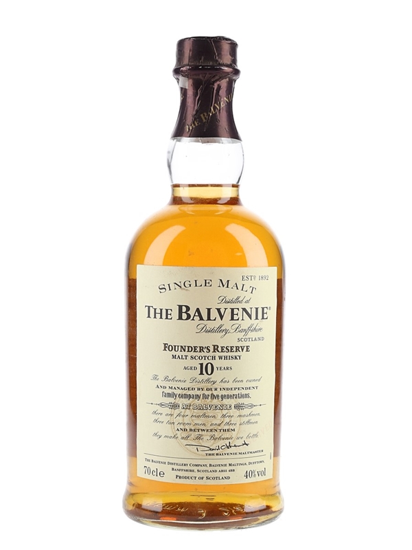A bottle of The Balvenie 10 Year Old Founder's Reserve Single Malt Scotch Whisky.