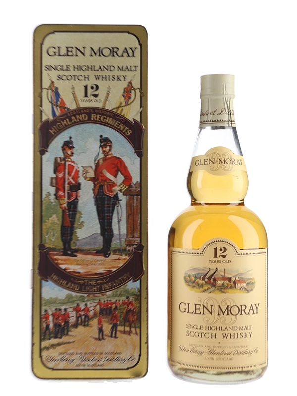 A bottle of Glen Moray 12 Year Old Single Highland Malt Scotch Whisky in a Scotland's Historic Highland Regiments tin. This tin depicts The Argyll and Sutherland Highlanders. We estimate this was bottled in the 1980s.