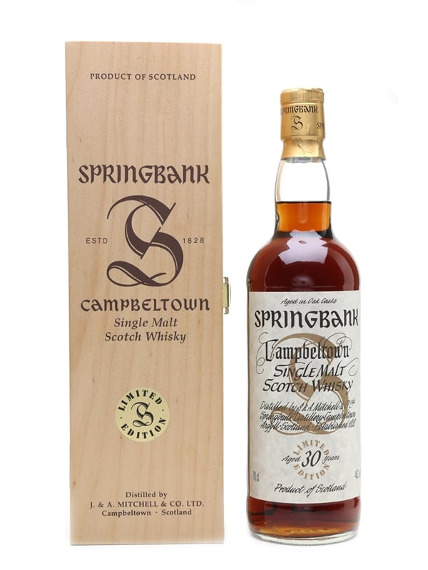 A bottle of Springbank 30 Year Old, released in March 1999 as the second installment of the distillery's Millennium series.