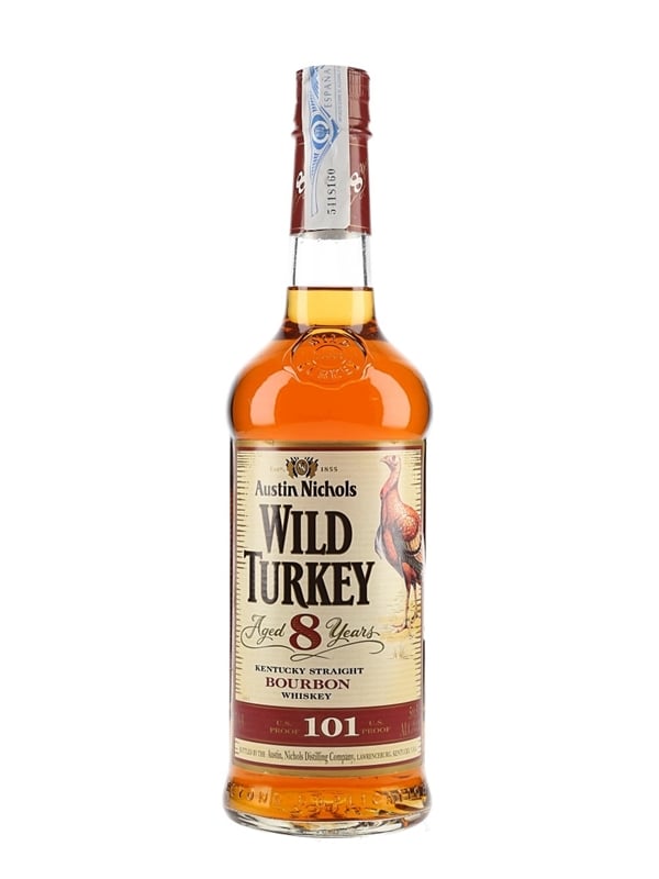 A bottle of Wild Turkey 8 Year Old 101 Proof Kentucky Straight Bourbon Whiskey, bottled at 50.5% ABV by Austin Nichols Distilling Company, Lawrenceburg, Kentucky.
