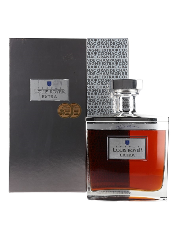 A bottle of Louis Royer Extra Cognac in a presentation box.
