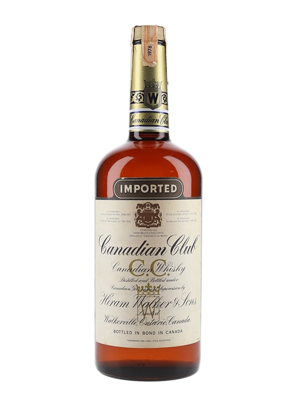 A bottle of Canadian Club, produced by Hiram Walker & Sons Limited, bottled for the duty free market. The Canadian tax strip reads 1976. This indicates that the youngest whisky in the bottle was distilled in 1976.