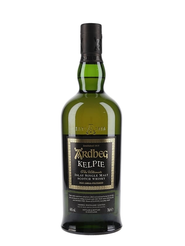 A bottle of Ardbeg Kelpie The Ultimate Islay Single Malt Scotch Whisky, an expression inspired by myths and legends of the sea. Some of the malt was matured in Black Sea oak casks from the Adyghe Republic before marrying with Ardbeg's bourbon cask spirit.