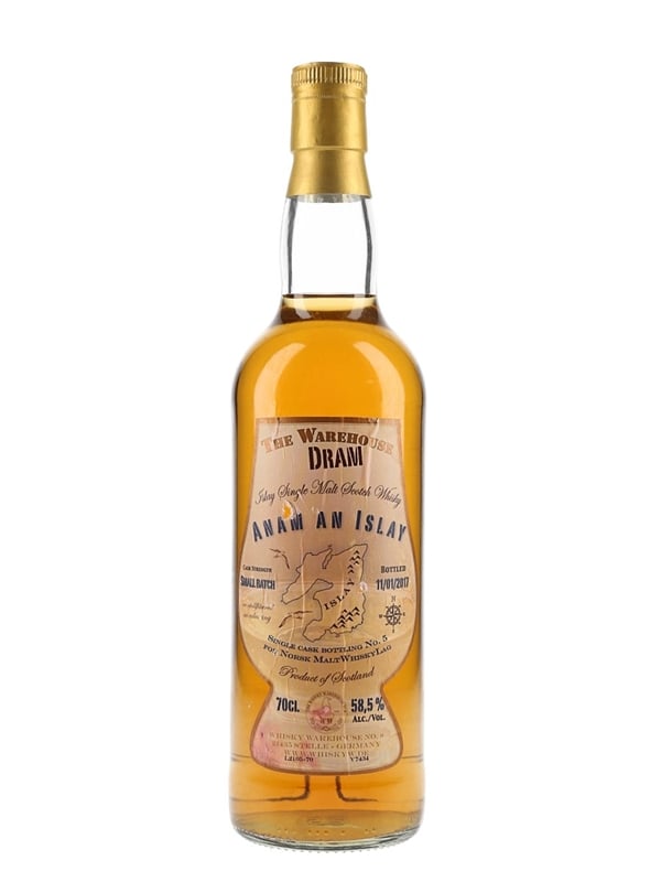 A bottle of Anam An Islay, bottled at a cask strength of 58.5% ABV on 11 January 2017 for The Warehouse Dram series, bottled by Whisky Warehouse No.8 for Norsk MaltWhiskyLag.