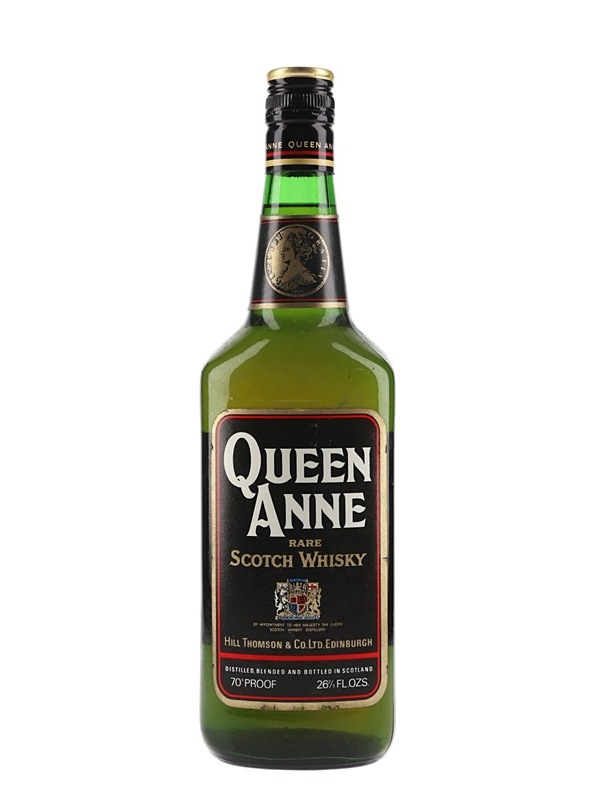 A bottle of Queen Anne Rare Scotch Whisky, blended and bottled by Hill Thomson & Co. (then a member of The Glenlivet Distillers Ltd). We estimate this was bottled in the 1970s.