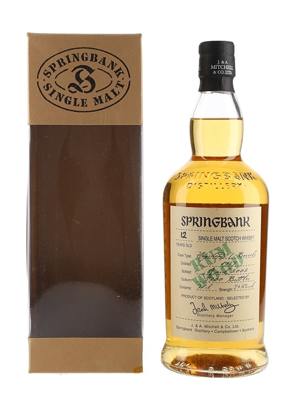 A bottle of Springbank 12 Year Old Single Malt Scotch Whisky. This was distilled in 1989, matured for 12 years in hogsheads and traditional barrels before being finished in rum wood casks and bottled at 54.6% ABV in April 2002.