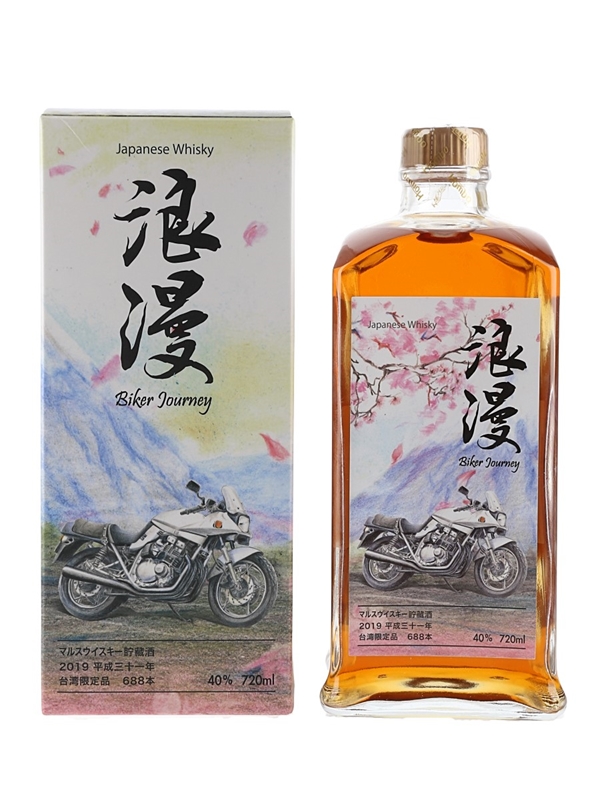A bottle of Mars Kura Whisky Biker Journey Batch 01, produced and bottled by Hombo Shuzo Co. Ltd. at Shinshu Mars distillery. This was bottled for Taiwan's 2T motorcycle club.