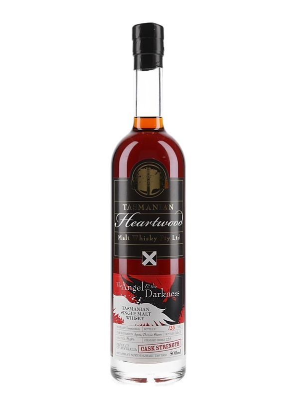 A bottle of Heartwood 'The Angel & The Darkness' Cask Strength Tasmanian Single Malt Whisky from Launceston distillery. This was matured in Apera and Oloroso Sherry before being bottled at 56.8% ABV in July 2021.