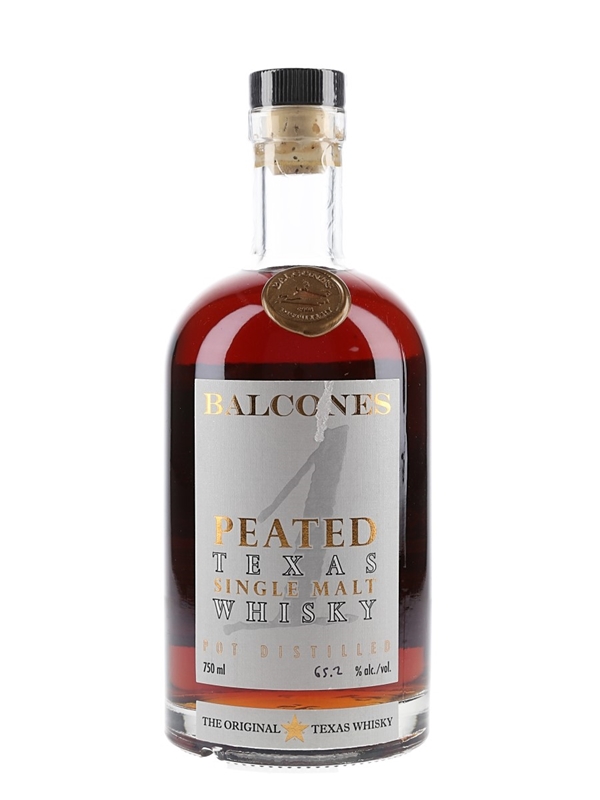 A bottle of Balcones Peated Texas Single Malt Whisky pot distilled. This was aged at least 36 months in oakand bottled by Balcones Distilling, Waco, Texas.